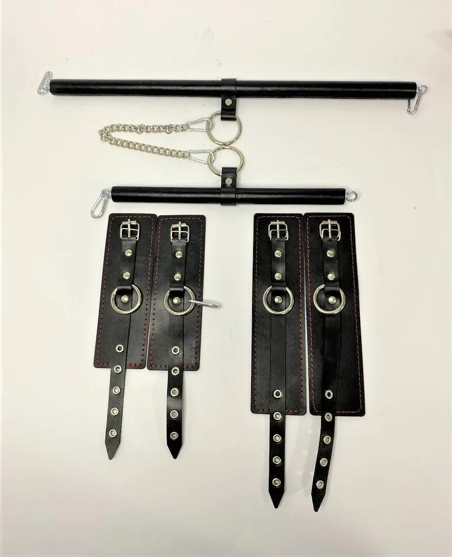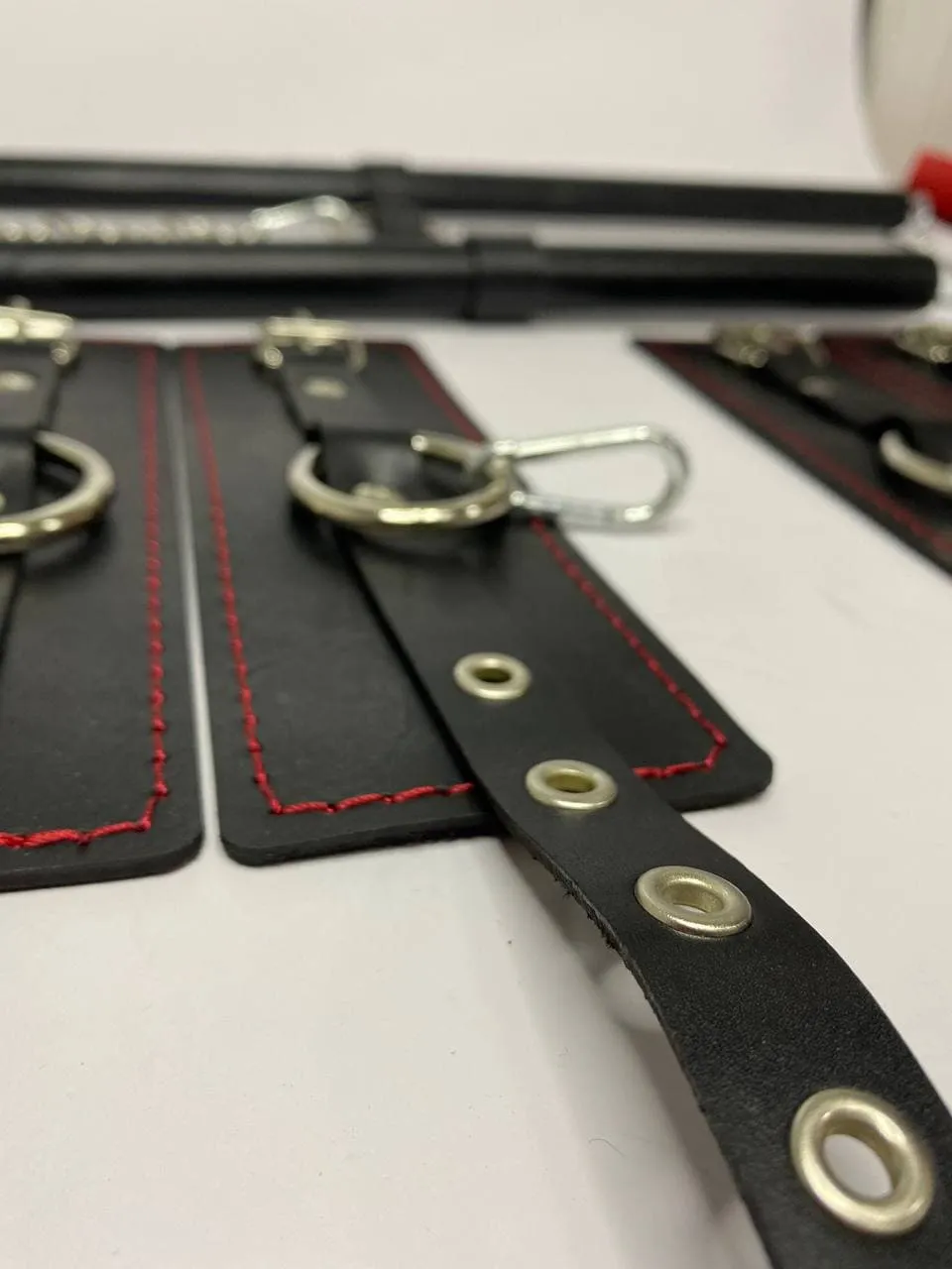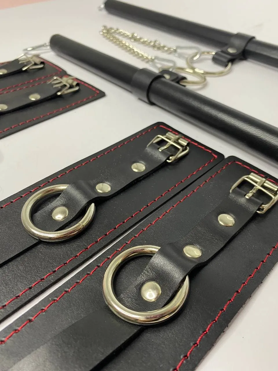 Изготовленный из натуральной кожи с надежными металлическими креплениями, набор сочетает прочность, долговечность и изысканный дизайн. Каждая деталь выполнена с заботой о комфорте и безопасности партнёра, обеспечивая удобство фиксации и свободу движений там, где это необходимо.