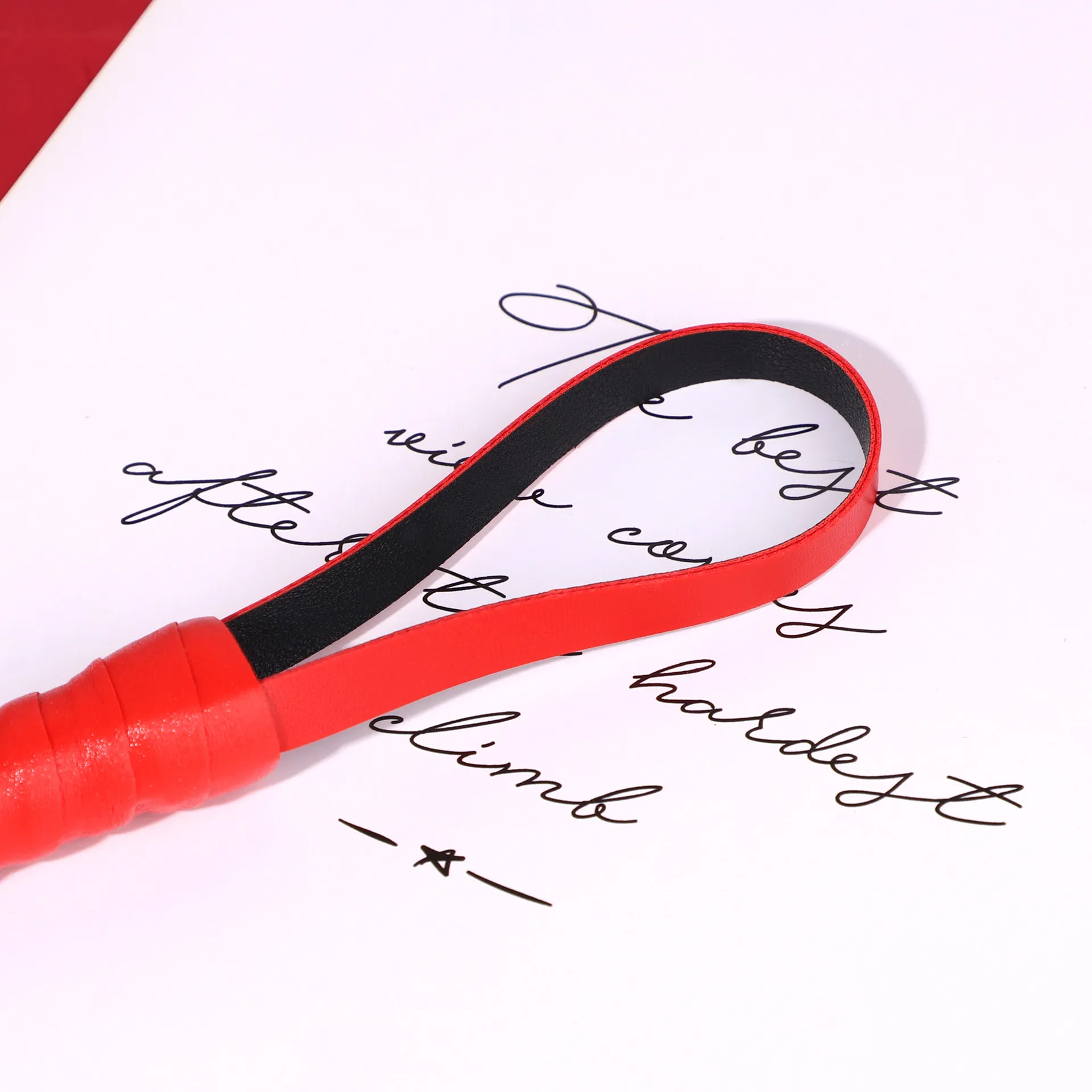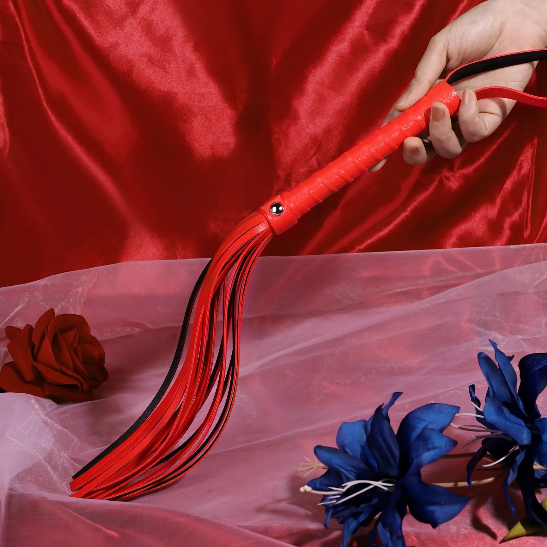 Яркий красный цвет придаёт аксессуару визуальную выразительность, подчеркивая атмосферу страсти и доминирования. Удобная эргономичная ручка обеспечивает надёжный хват и комфортное использование даже при длительных играх.