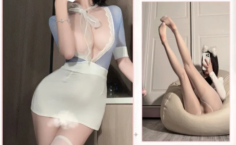 Облегающее платье подчёркивает изгибы фигуры и создаёт эффект строгой элегантности, а прозрачный шарфик на шее добавляет нотку утончённости. Фирменный головной убор в стиле стюардессы завершает образ, делая его узнаваемым и игривым. Особая деталь комплекта — колготки с открытым доступом, которые превращают строгий стиль в откровенный и провокационный.