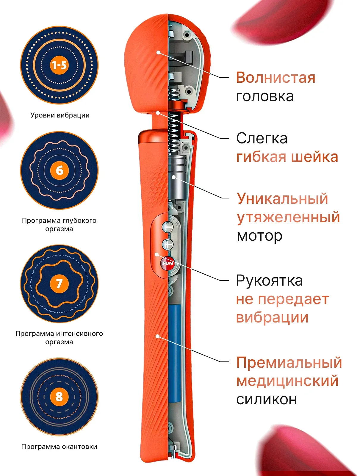 Мощный, но тихий мотор обеспечивает гулкую вибрацию на любой скорости, а управлять устройством легко благодаря 3 режимам и 5 скоростям вибрации. Вибрация сосредоточена в головке массажера, а небольшой вес устройства (430 г) позволяет долго использовать его без усталости рук.